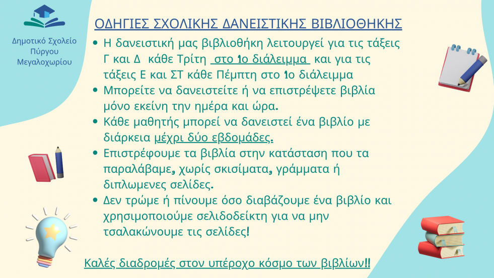 μπορούν να επισκέπτονται τη σχολική βιβλιοθήκη, να δανείζονται και να επιστρέφουν βιβλία.